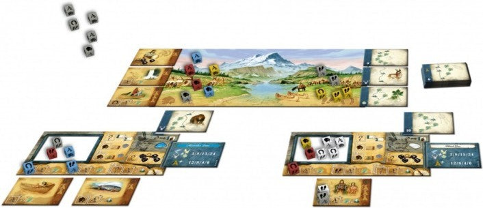 The Tribe/Discoveries cards you gain during the game score discovery points at the end. To get these cards, you have to perform exploration actions, and to do this you use dice. On your turn, you either:
