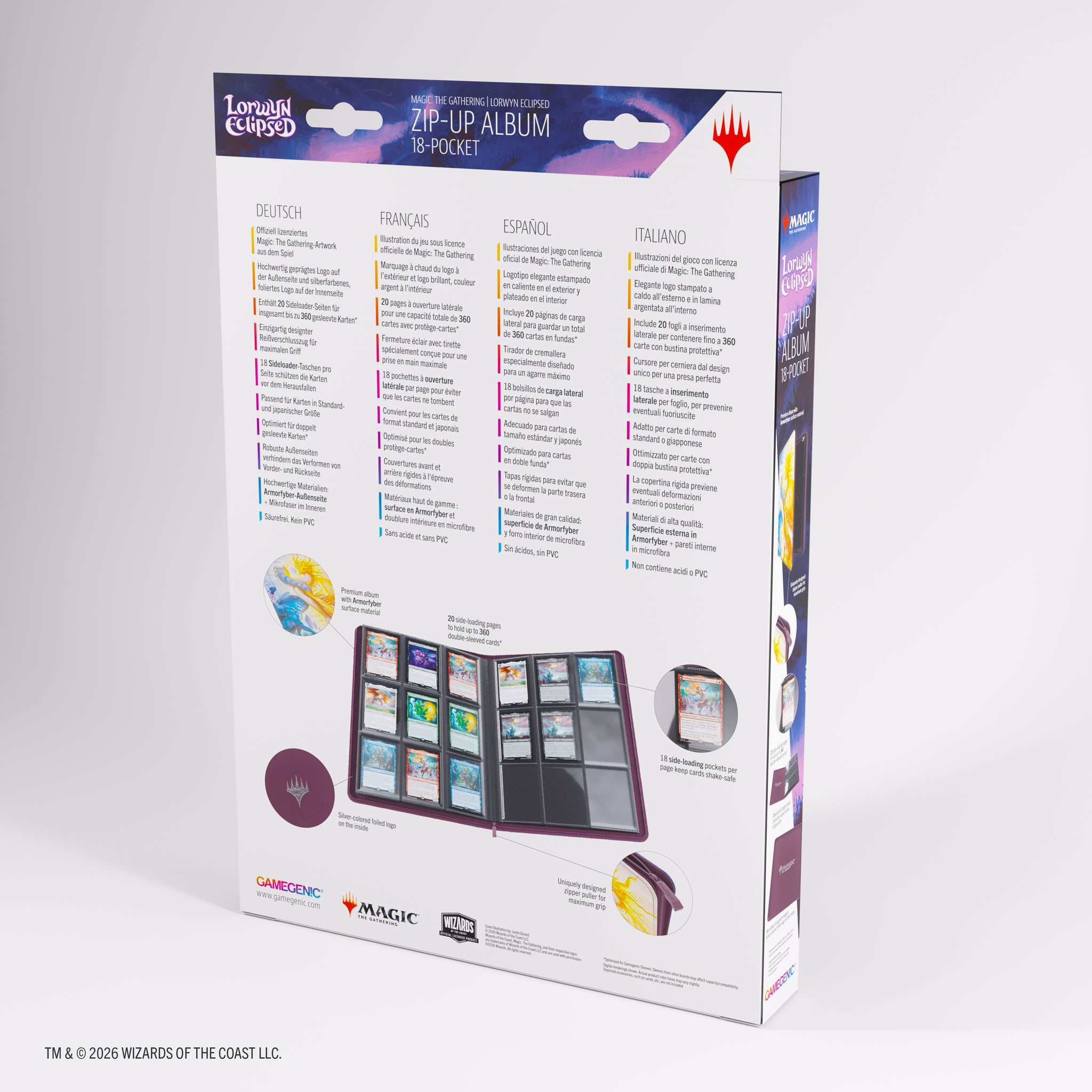 The Zip-Up Album 18-Pocket has a colorful vibrant high-quality, full-art prints from the game on the outside AND inside of the album! It holds 20 pages with 18 side-loading pockets each, for a total capacity of 360 cards (even double-sleeved*). The reinforced, rigid cover keeps the album from warping, and a uniquely designed zipper puller closes it from all sides.