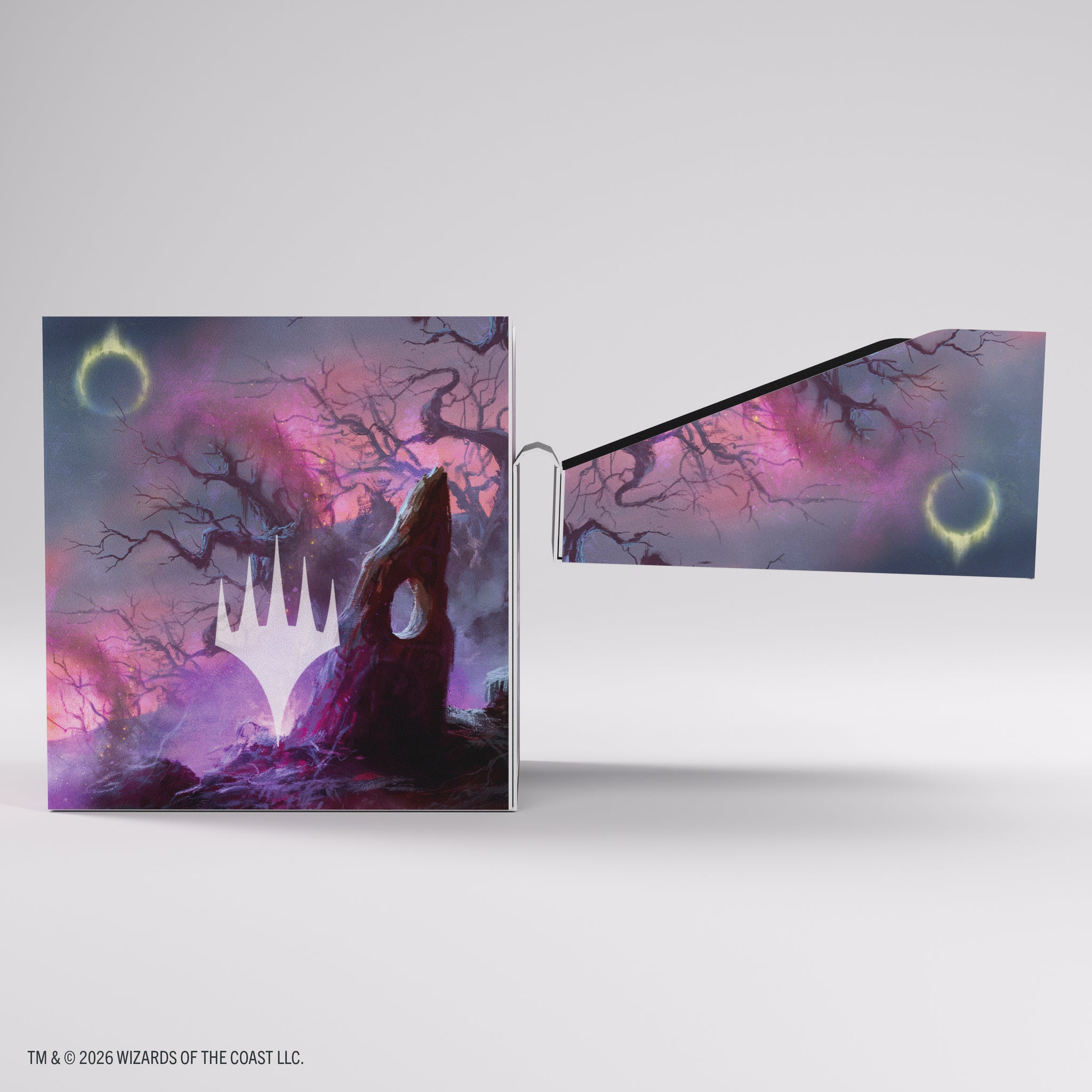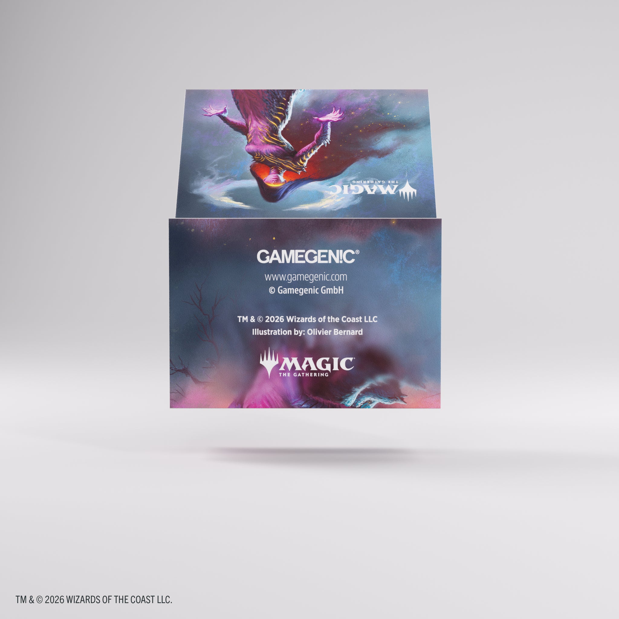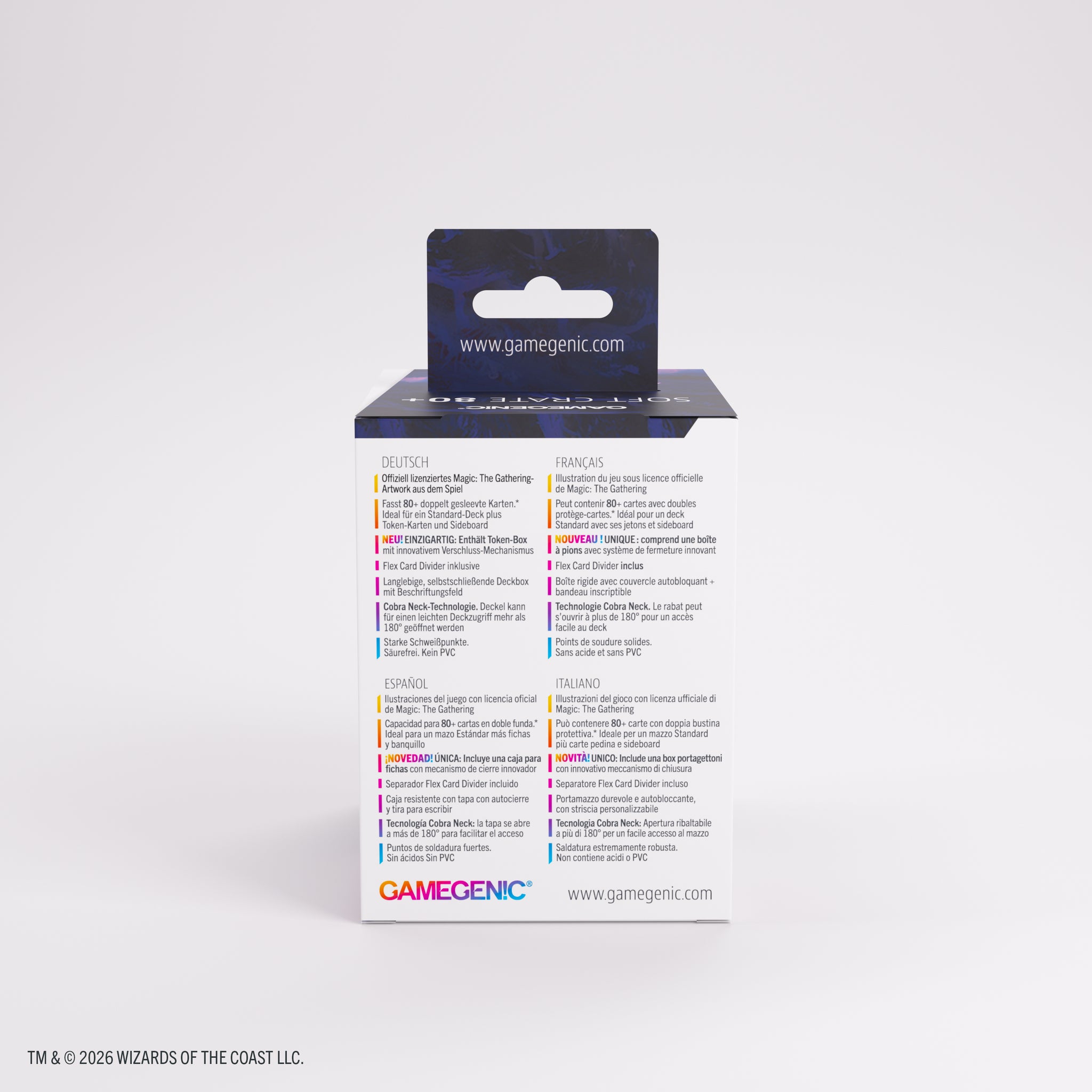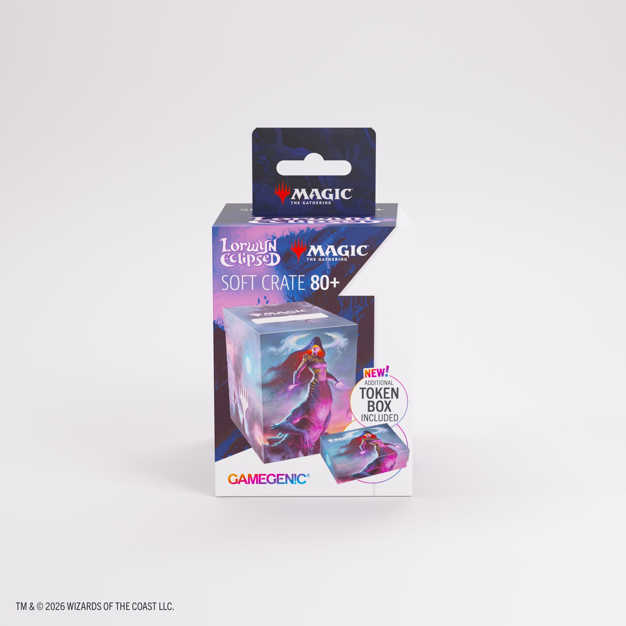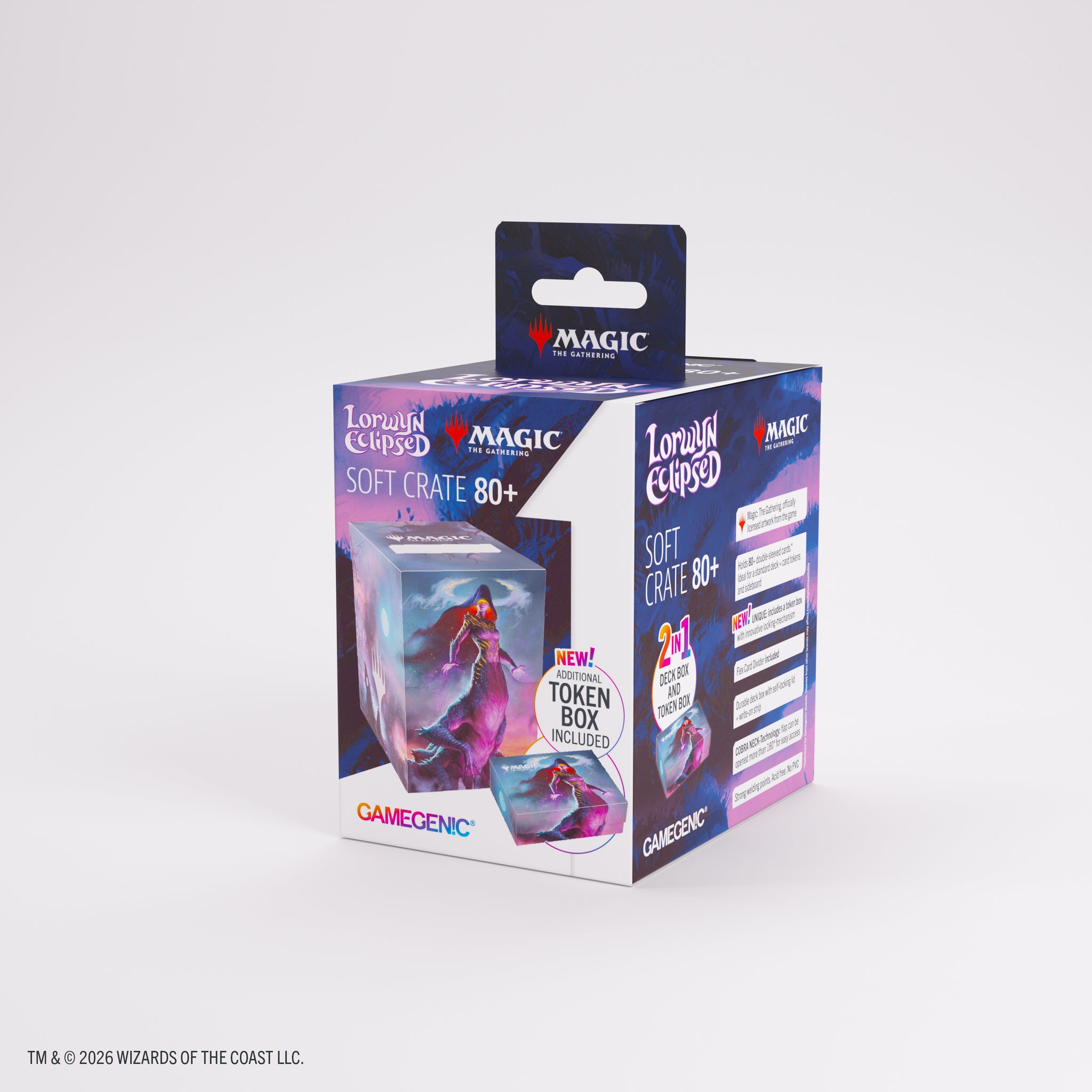 The Soft Crate is a durable all-in-one solution: the first 2-in-1 product that combines a full-size deck box with an integrated token box. This full-color printed deck box offers smart functionality and clever design. It holds up to 80 double-sleeved cards for standard formats, plus space for tokens and sideboard. Alternatively, it can fit up to 100 single-sleeved cards. The additional included token box stores dice, counters, and other small accessories. Equipped with a unique smart click-lock mechanism, the token box keeps everything securely stored. When opened, its lid remains upright for quick and easy access during play.