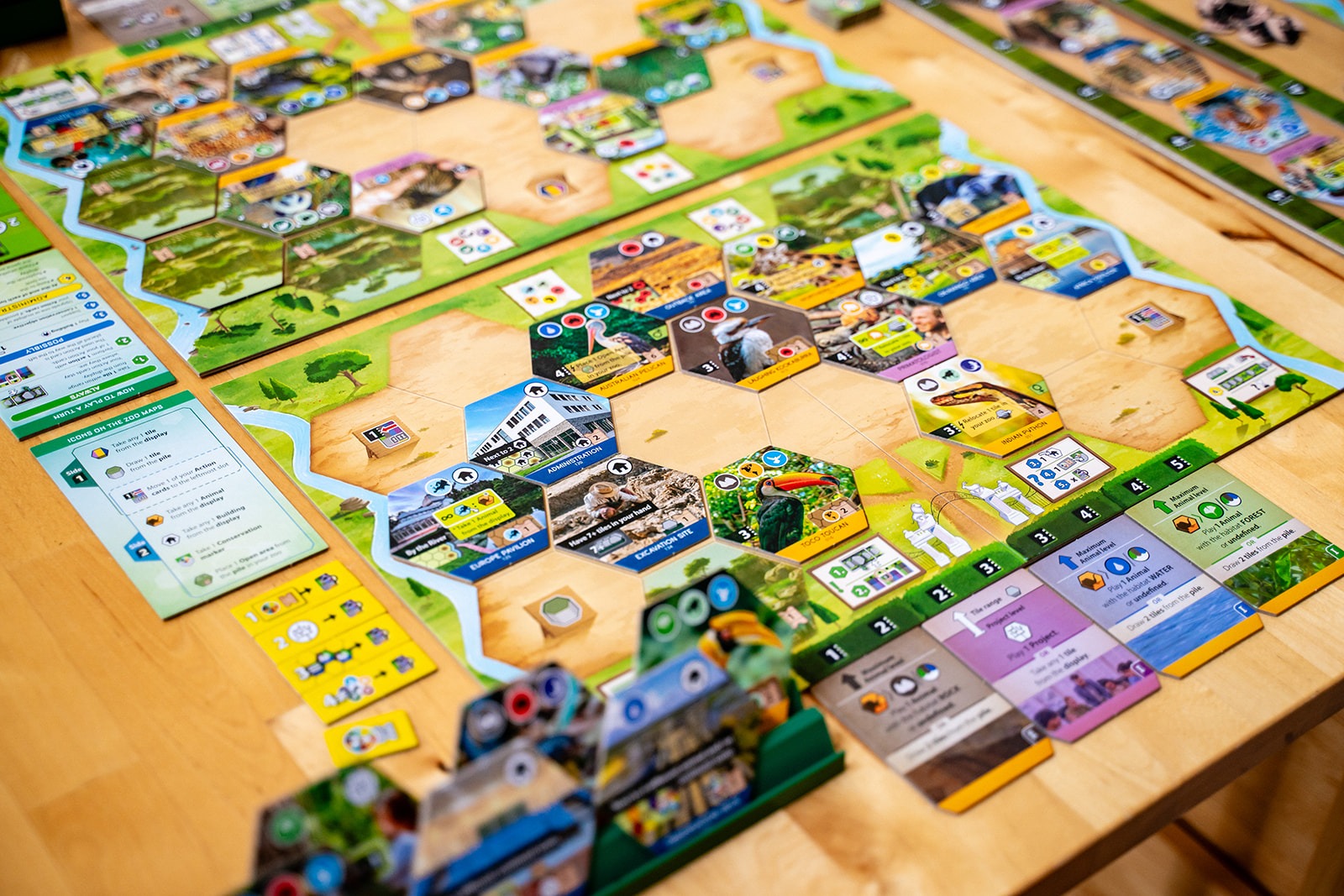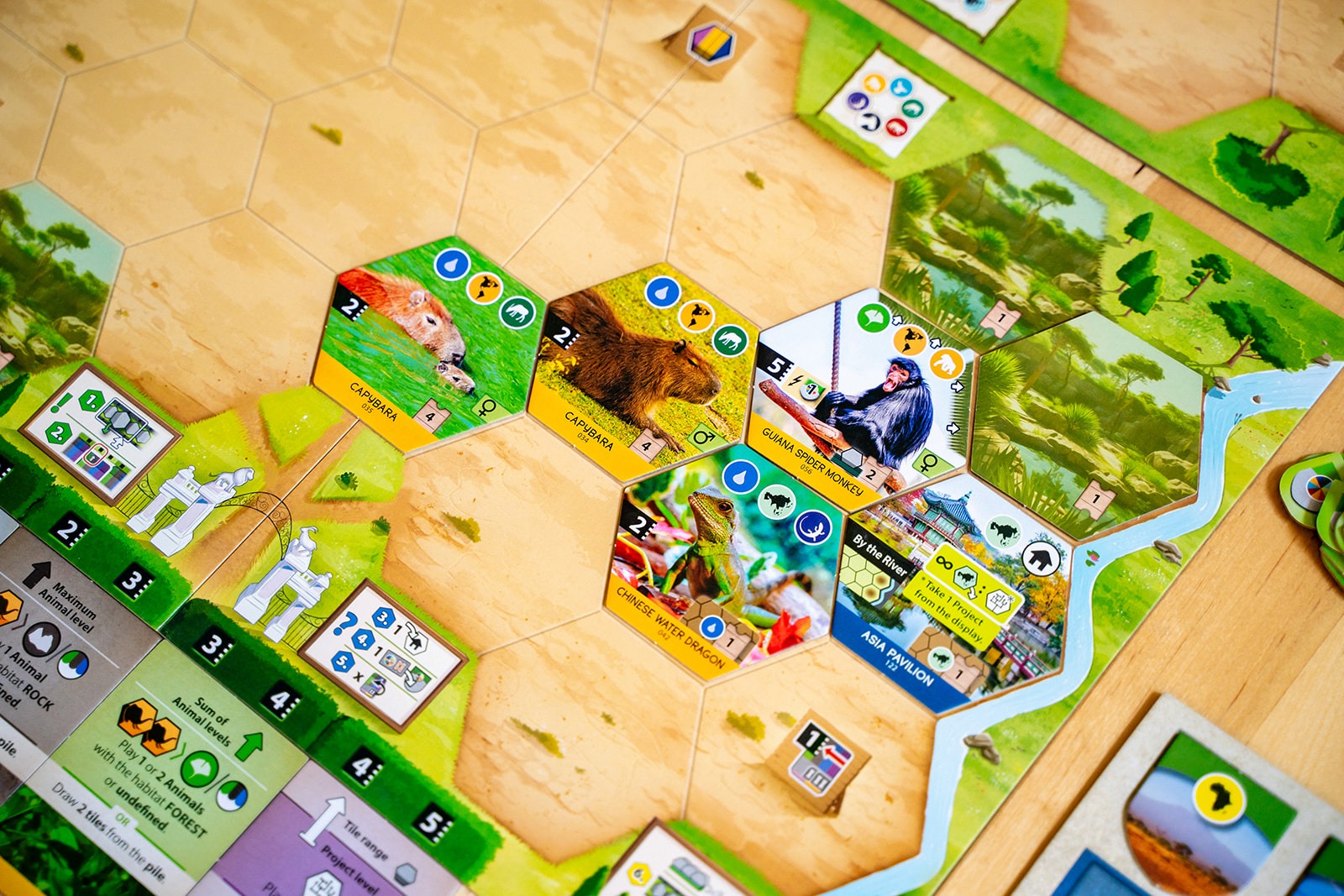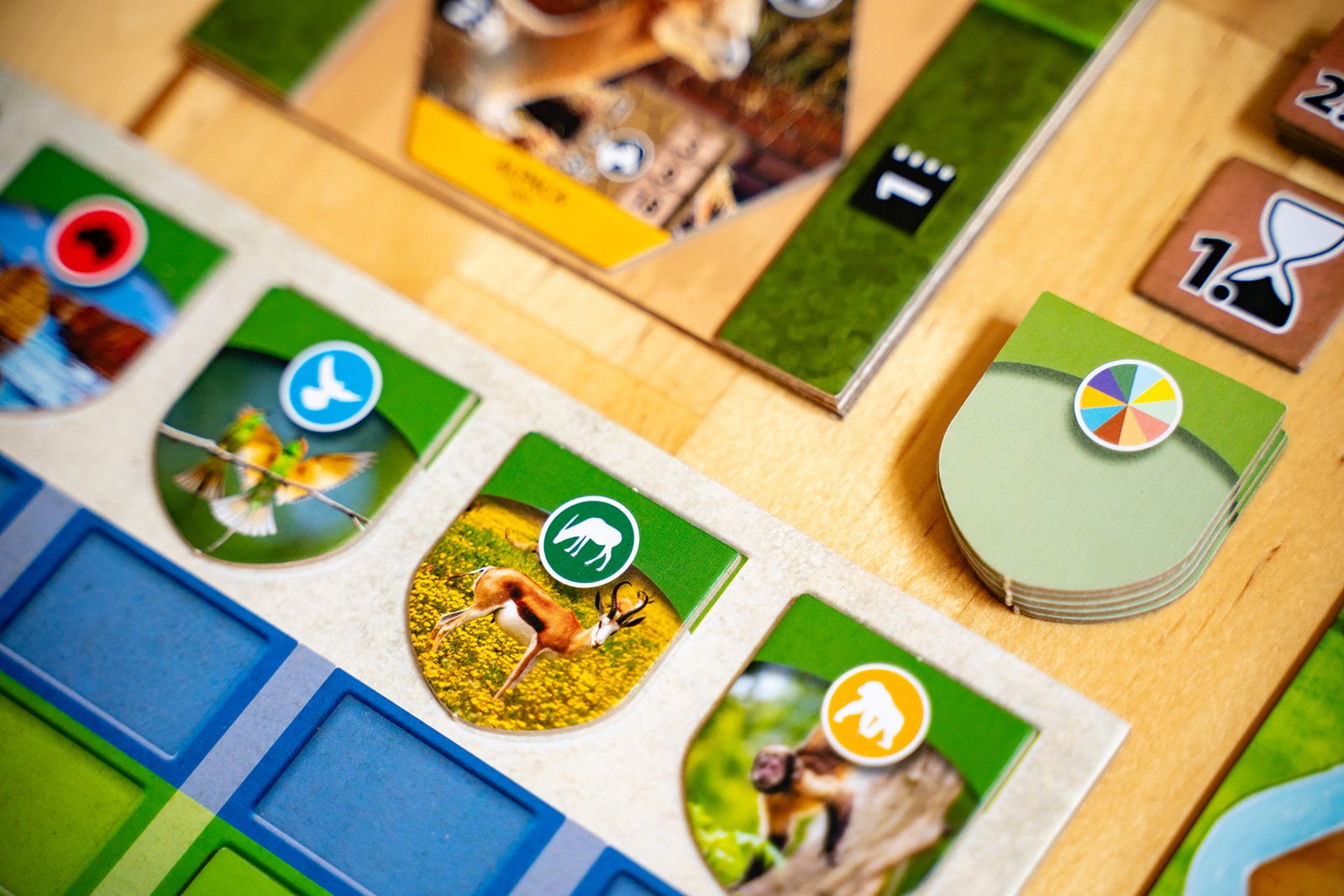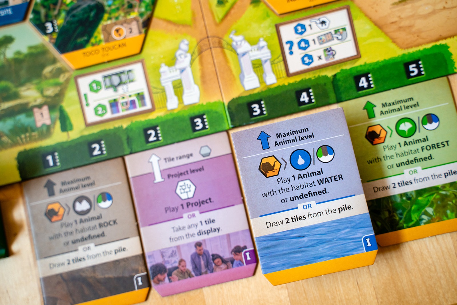Each player has a set of four action cards to manage their gameplay, and the power of an action is determined by the slot the card currently occupies. One of those cards will let you play projects, and the other three cards will let you play animals of a specific habitat: forest, rock, or water.
