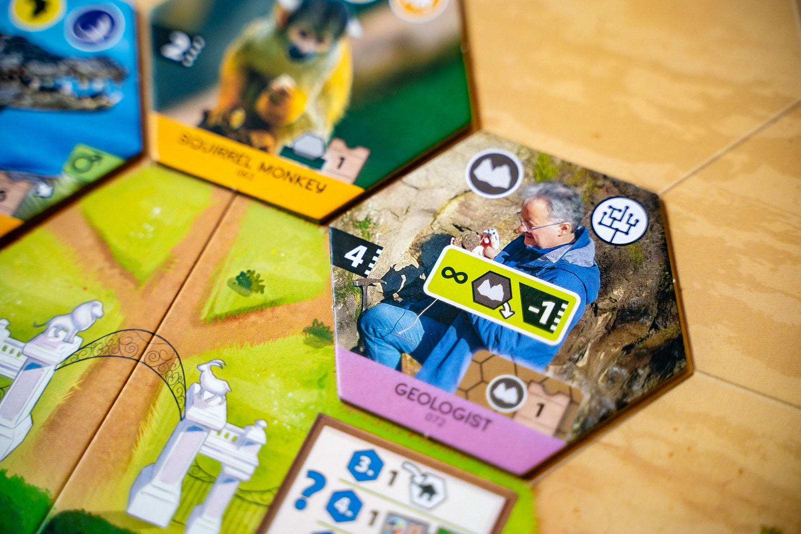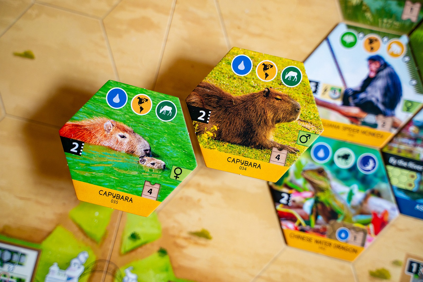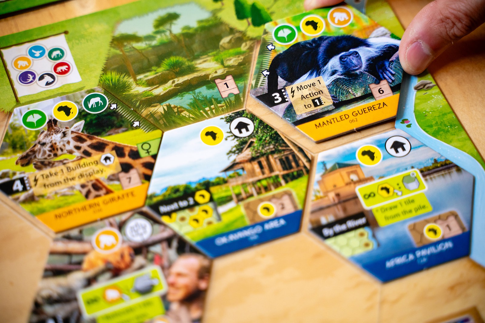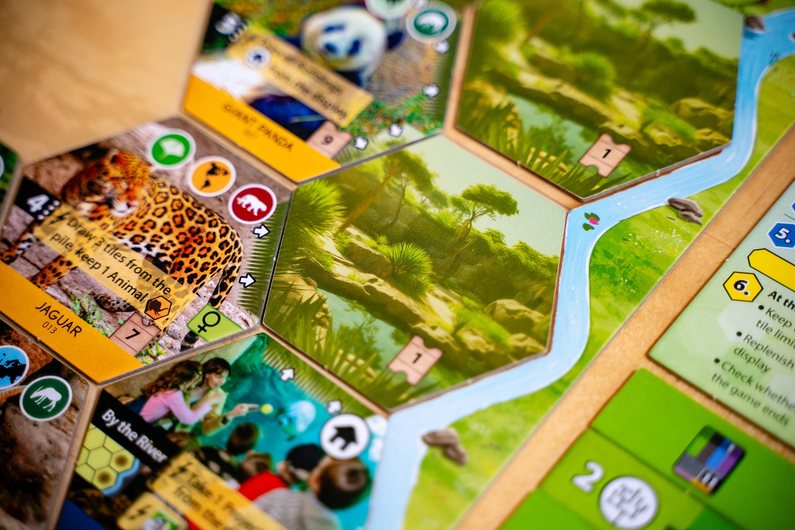 Each player has a set of four action cards to manage their gameplay, and the power of an action is determined by the slot the card currently occupies. One of those cards will let you play projects, and the other three cards will let you play animals of a specific habitat: forest, rock, or water.