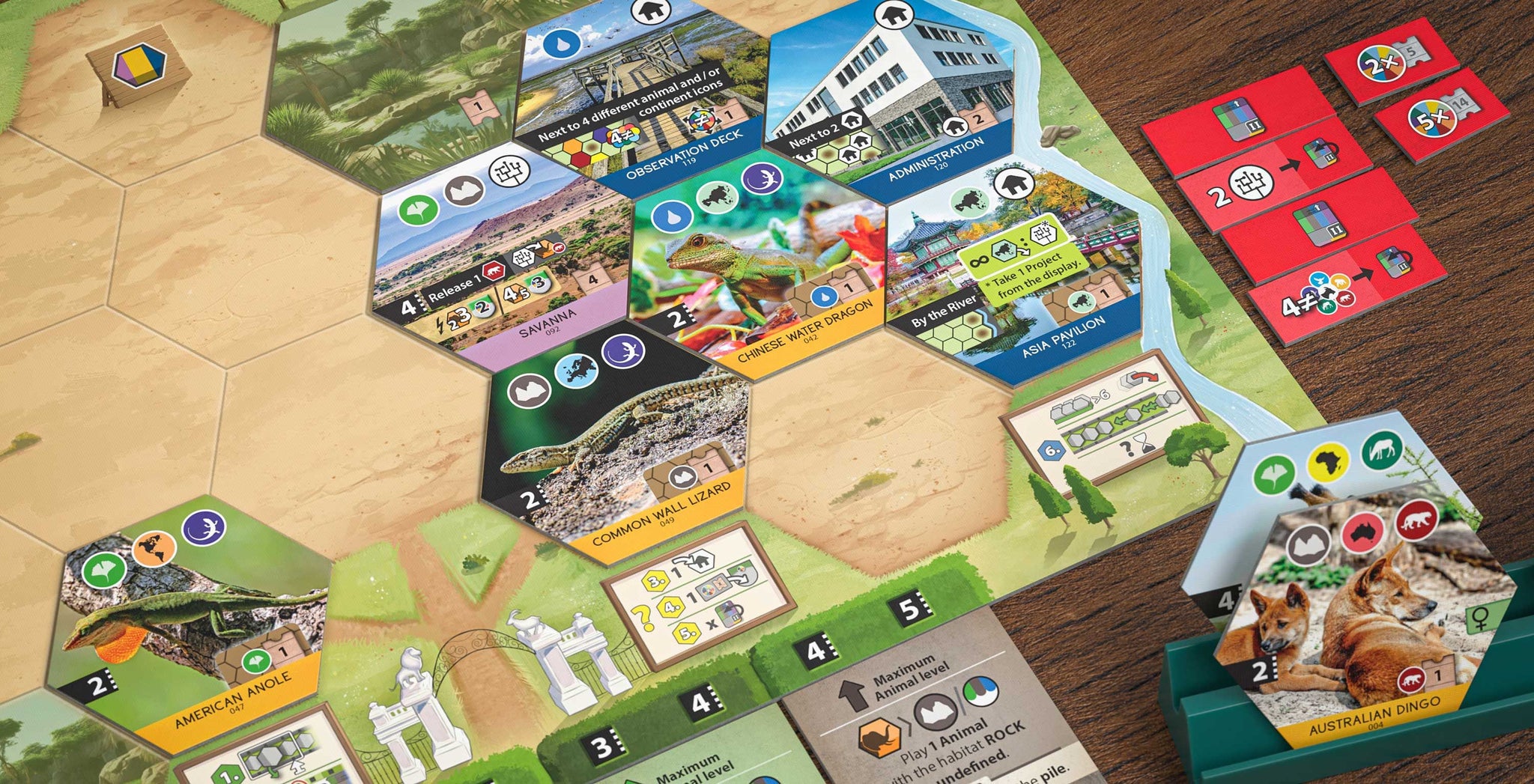 In Sanctuary, you will plan and design a modern, scientifically-managed zoo for animals and visitors. A supply of 135 unique zoo tiles provides you with animals, buildings, and projects. In every game, you want to find the best mix from those available to build the most successful zoological establishment. Different effects on the tiles will help you to achieve conservation goals and to increase the attraction of your zoo.