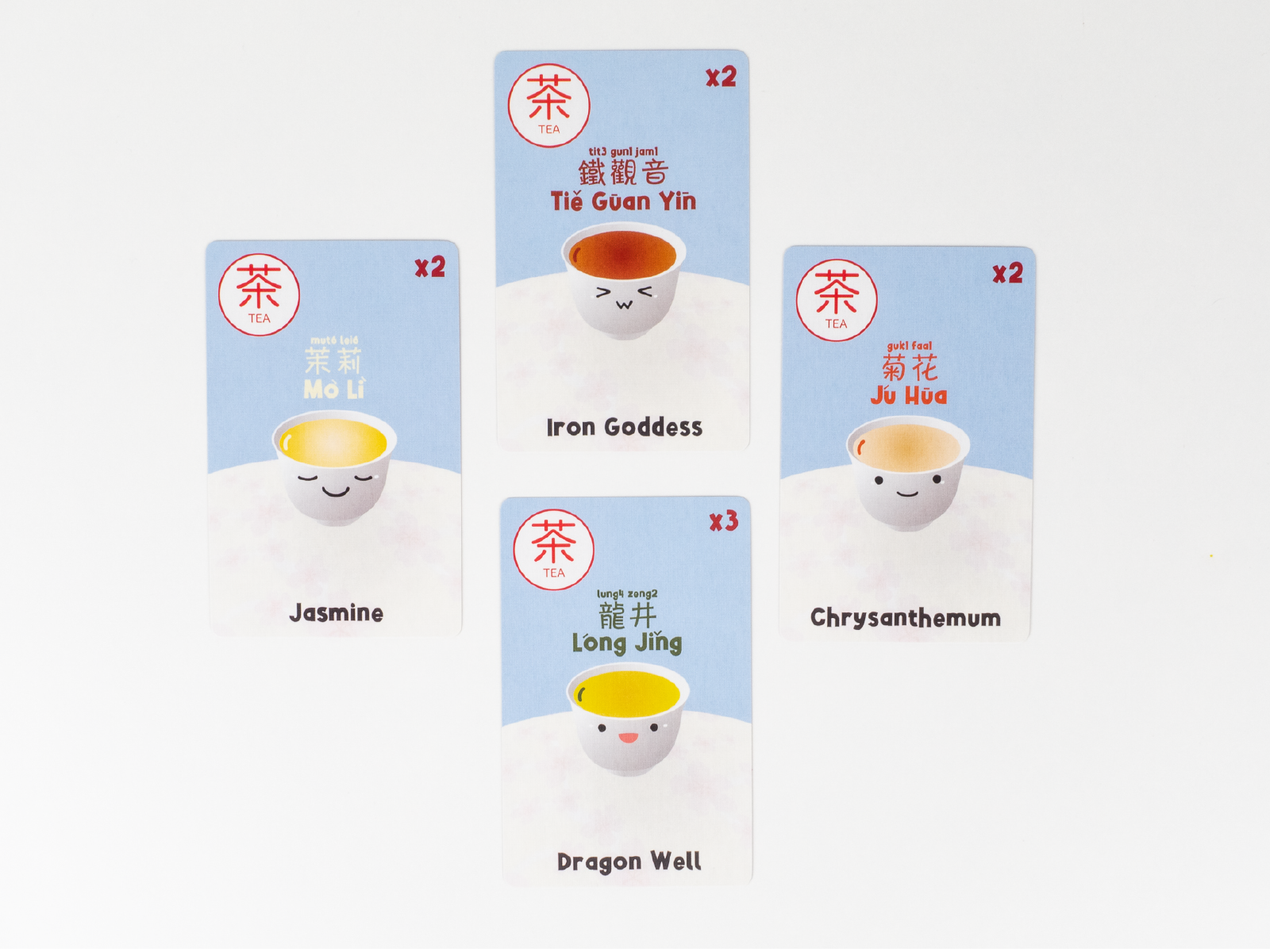 A round of Yum Cha ends when a player draws the eleventh card which makes a complete hand, revealing 3 sets of dim sums and 1 pair of tea. When they do so, they announce Yum Cha! and the round ends. A set of dim sums consists of three unique dim sums from the same tier. Duplicate dim sums can2 - 6not form a part of a set. A pair of tea consists of two tea cards of the same flavour.