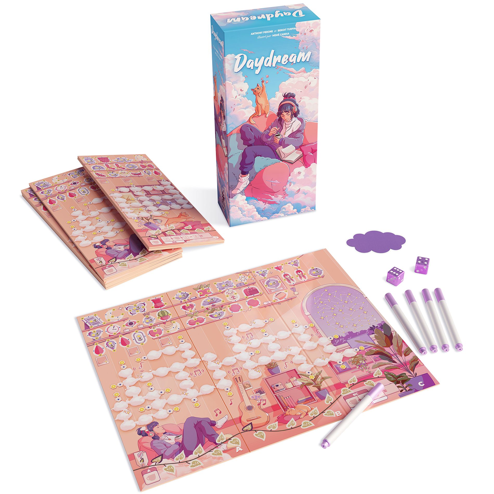 Daydream is a cozy roll-and-write. Fill your cloud grid simultaneously adding the values of the dice. Make the right choices so that each cloud line contains only different numbers. Even better, if the numbers are consecutive, you create a perfect line. However, if a number appears more than once, the line is lost. Draw items on the shelf each time you complete a line correctly. Collect as many items as you can to win the game.